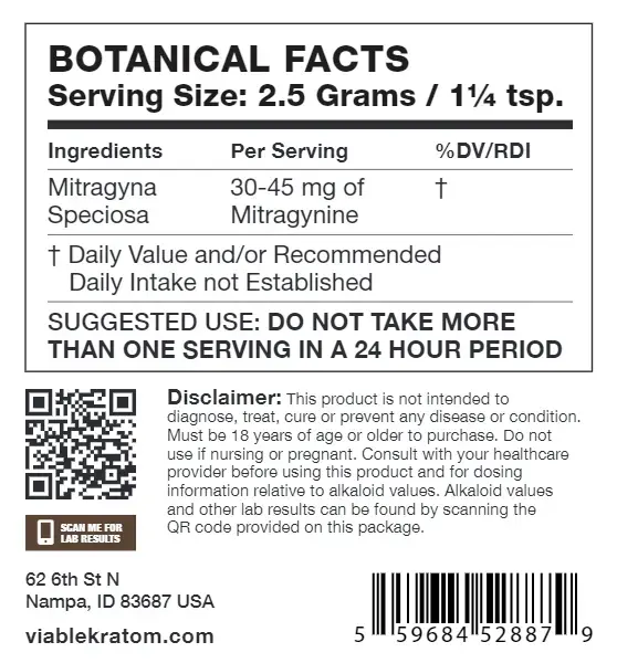 Every Viable Kratom product we sell is lab tested for authenticity, purity, and potency. Lab results for any product we manufacture can be found by scanning the QR Code on the label then entering the LOT number located at the top of the package.